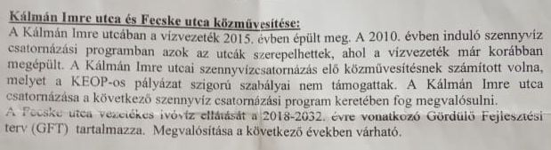 A Kálmán Imre közben már legalább előzetes helyszíni szemle történt a tervezők részéről, de a Fecske utcában, ahol súlyosabb a helyzet, ilyenről sem tudnak. Az ígéreteket köszönik, megoldást, vezetékes vizet szeretnének. Elfeledett szegletei ezek a városnak sajnos.