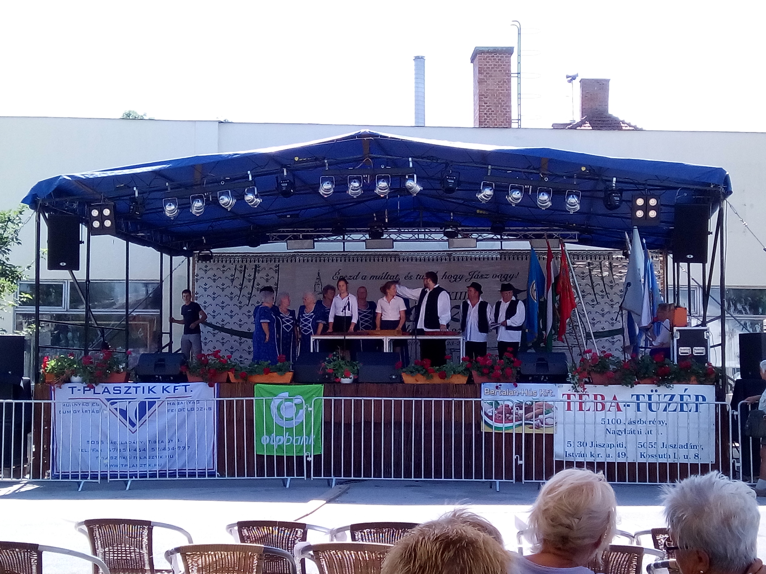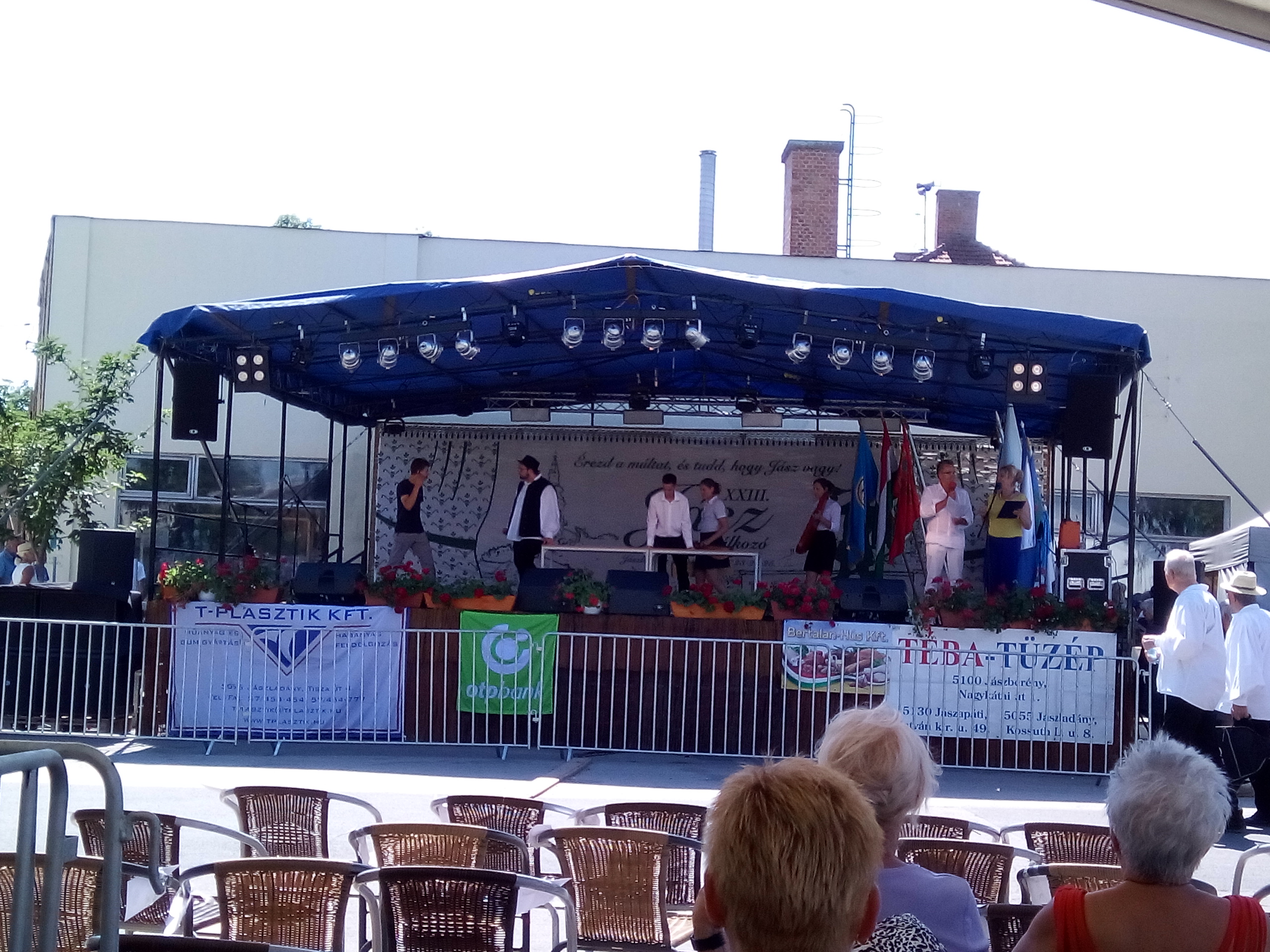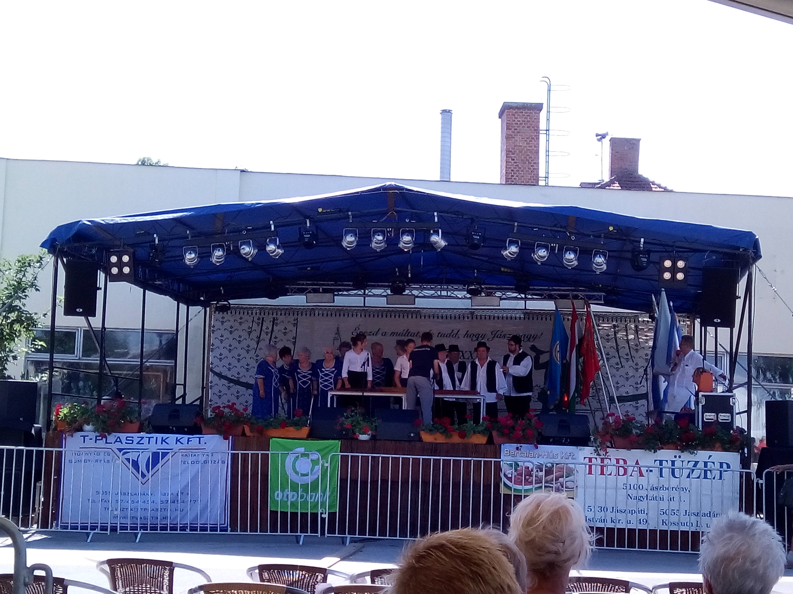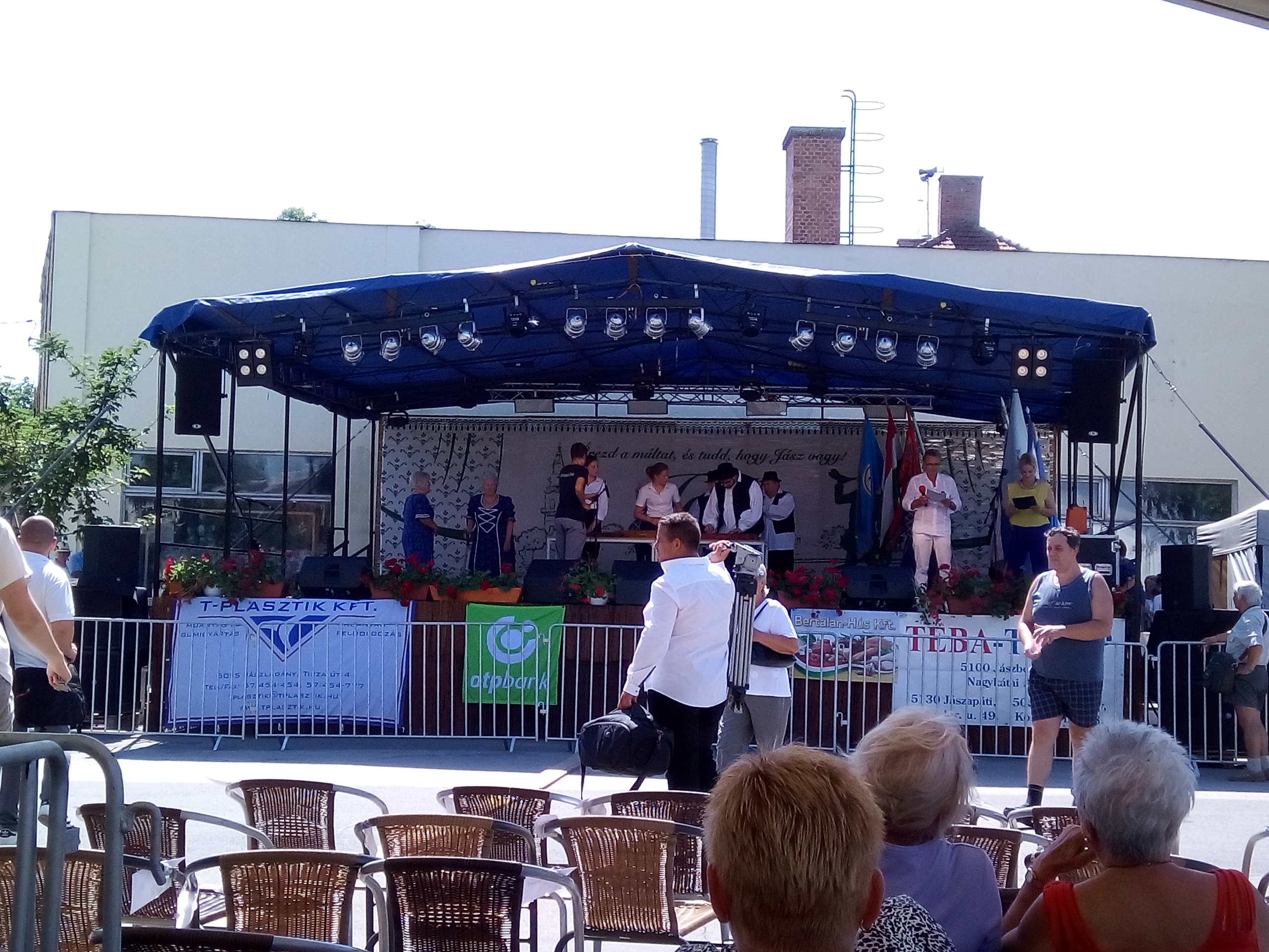 Ezek után végre ebéd, majd települések csoportjainak bemutatói. Felléptek a mieink is, elnézést, a videó minőségéért, és amiért kettő darabban van, de… a délelőtt padon hűsölő közmunkások beültek mögénk, és minek után a mi népünk művészete iránt nem kívántak tiszteletet mutatni, és próbálták ellehetetleníteni a jászok kulturált szórakozását… meg kellett kicsit szakítsam a felvételt. De legalább nem csak az egyébként nagy pozitívumként bőségesen osztogatott lajosmizsei ásványvíz miatt éreztük magunk otthonosan.