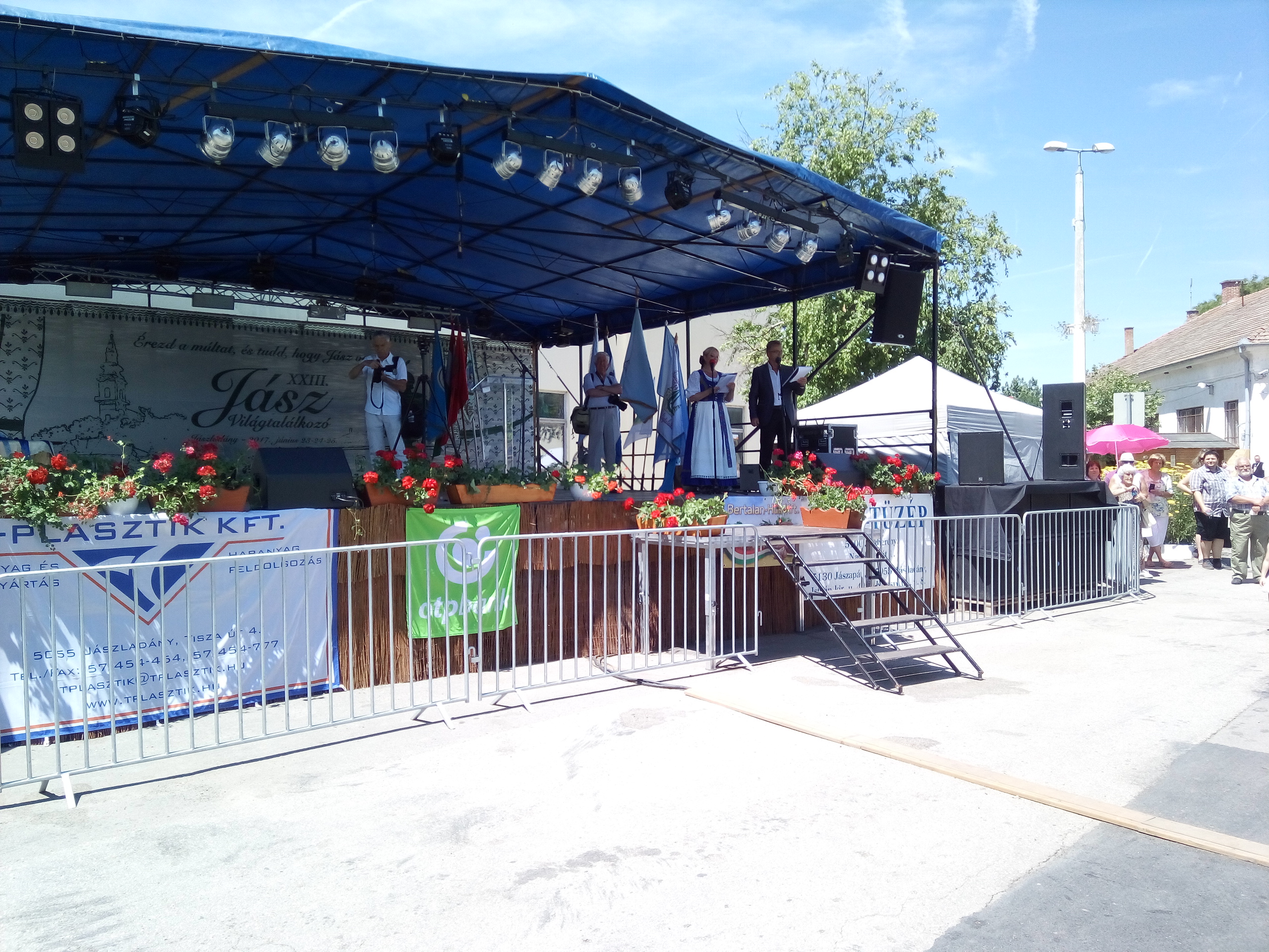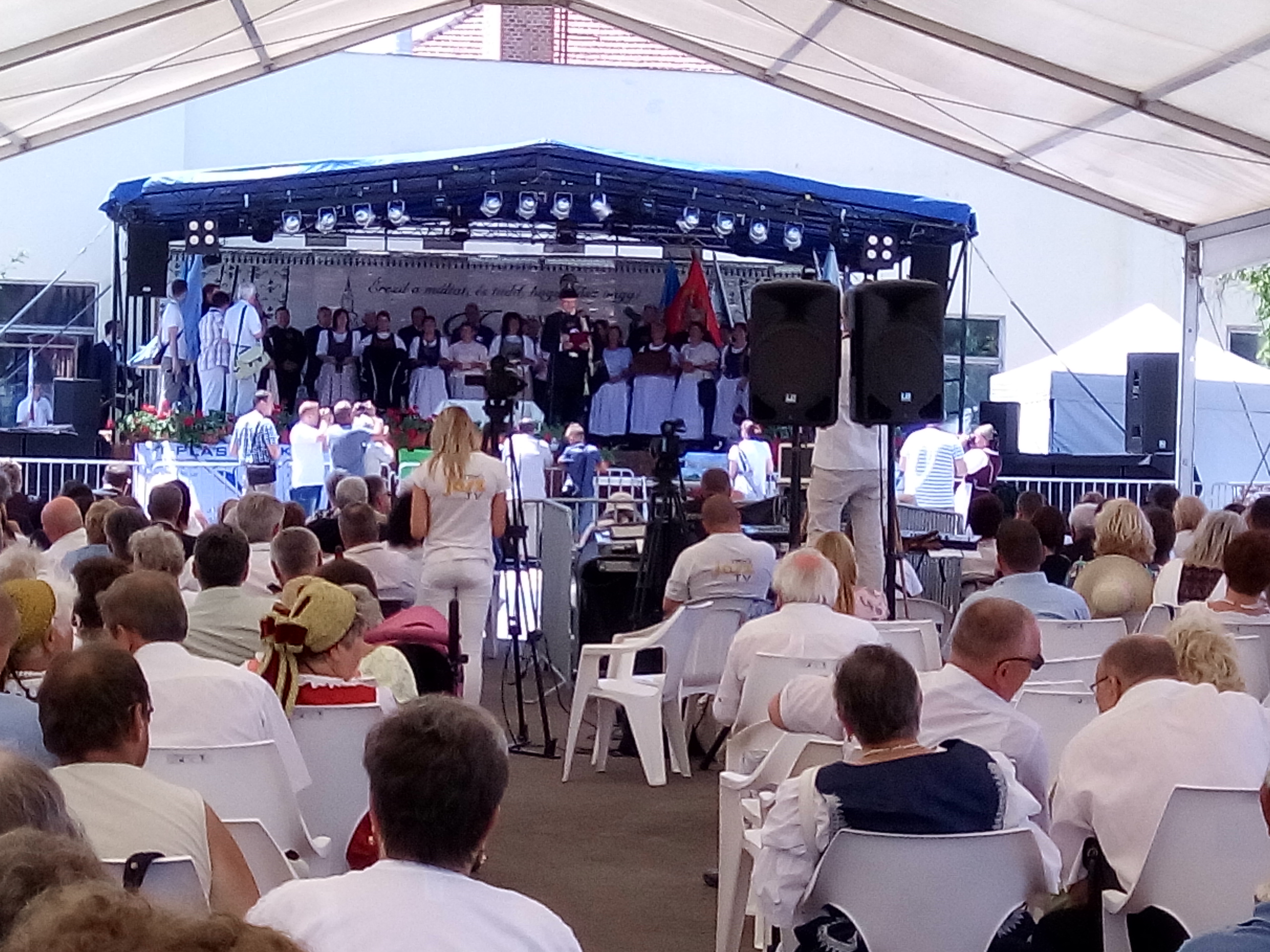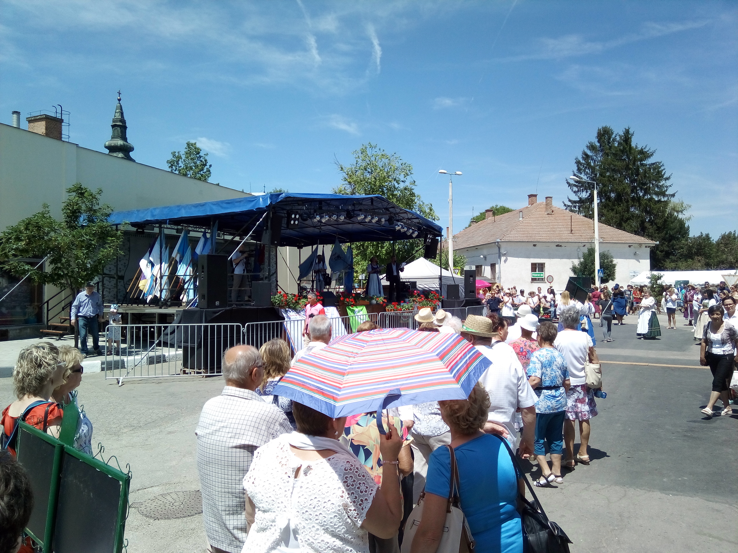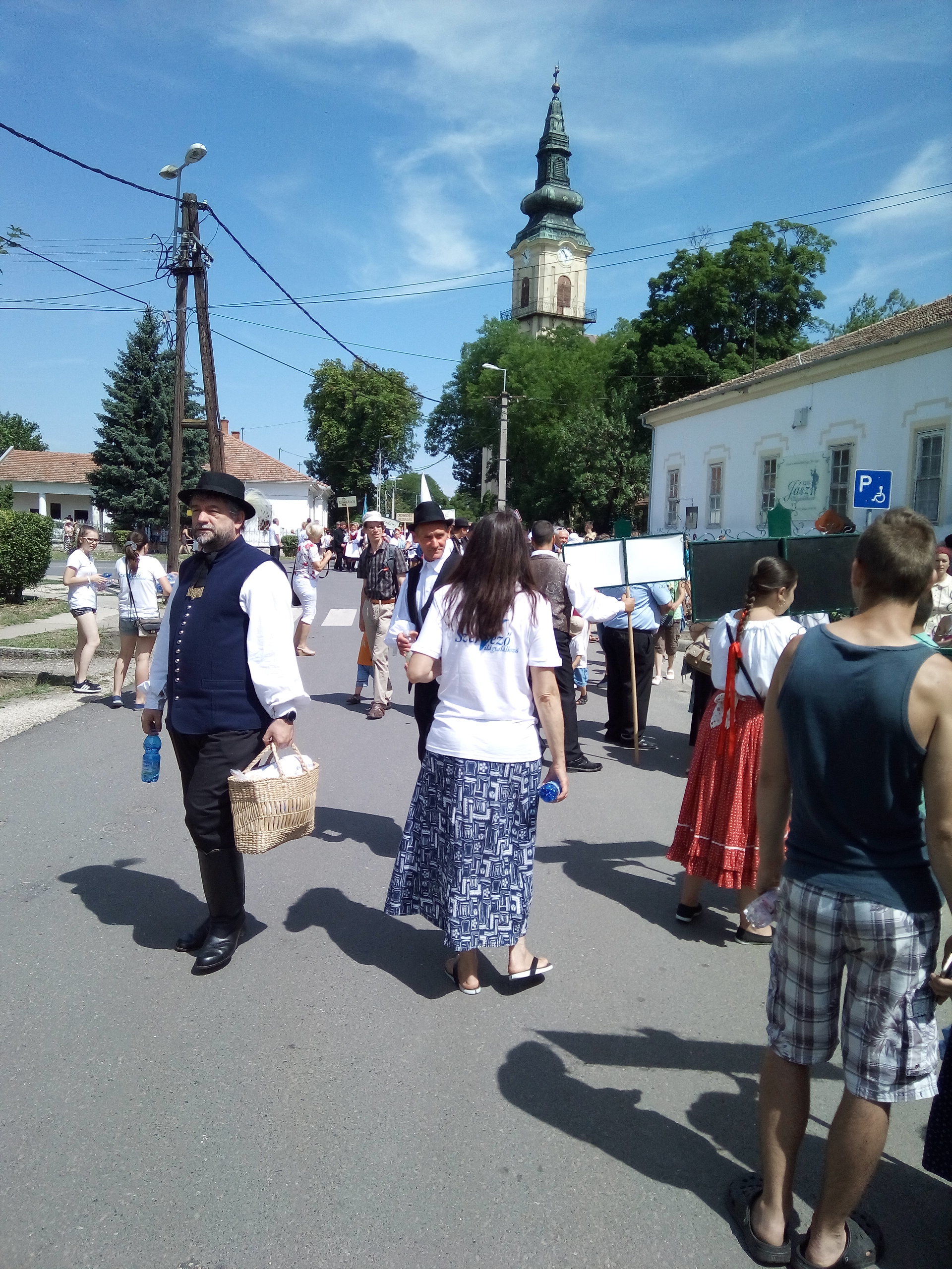 Ezek után végre ebéd, majd települések csoportjainak bemutatói. Felléptek a mieink is, elnézést, a videó minőségéért, és amiért kettő darabban van, de… a délelőtt padon hűsölő közmunkások beültek mögénk, és minek után a mi népünk művészete iránt nem kívántak tiszteletet mutatni, és próbálták ellehetetleníteni a jászok kulturált szórakozását… meg kellett kicsit szakítsam a felvételt. De legalább nem csak az egyébként nagy pozitívumként bőségesen osztogatott lajosmizsei ásványvíz miatt éreztük magunk otthonosan.