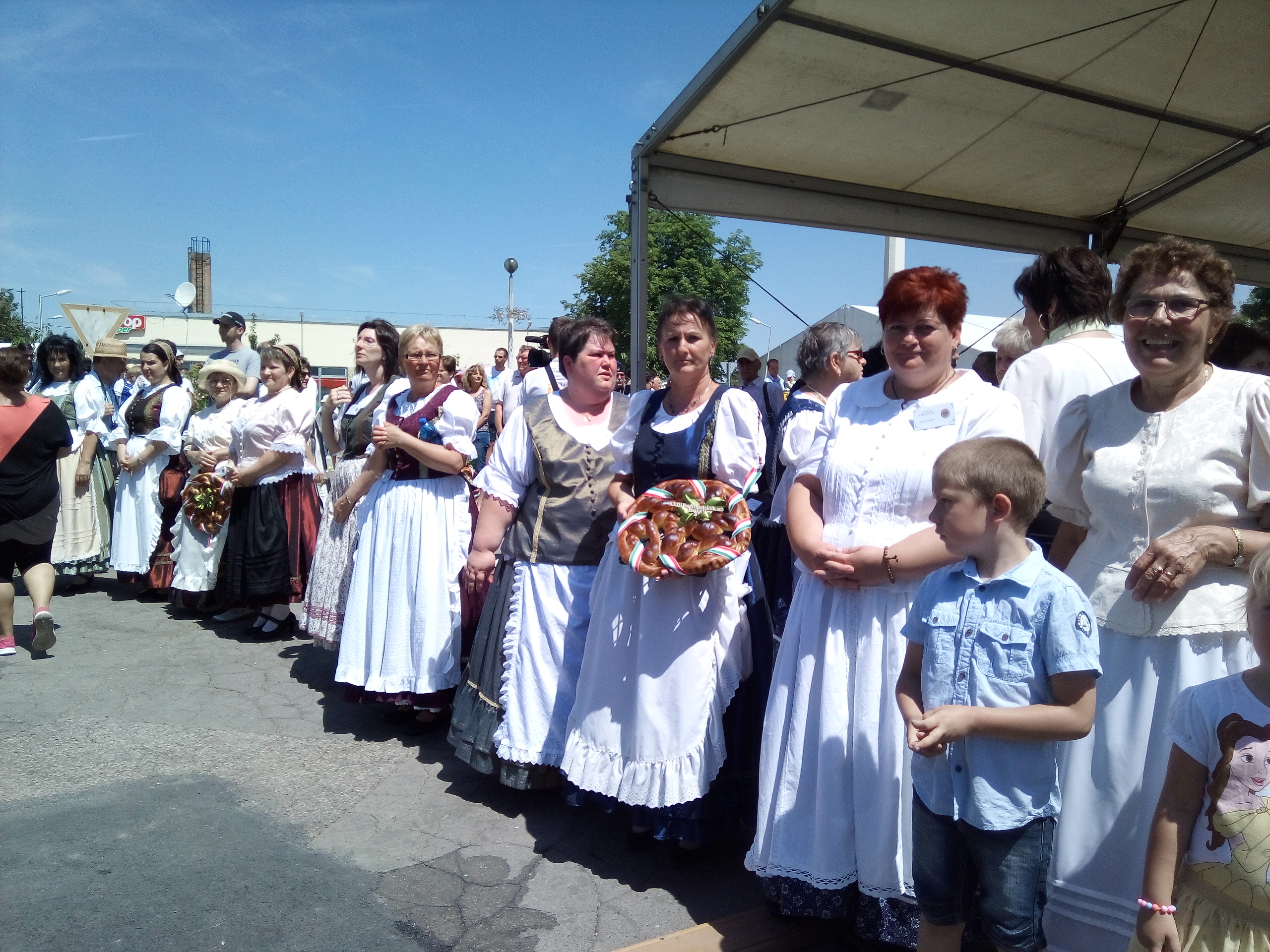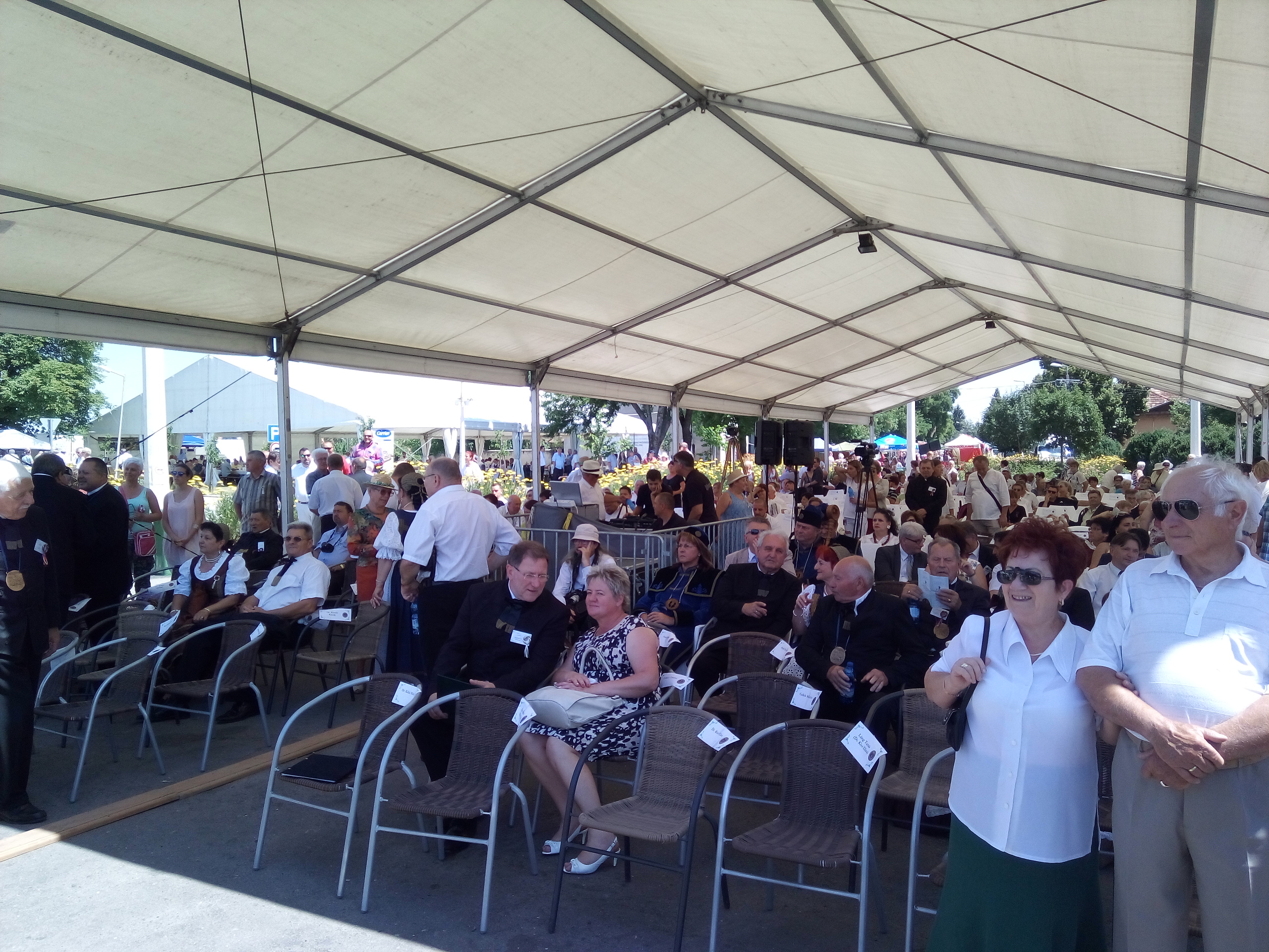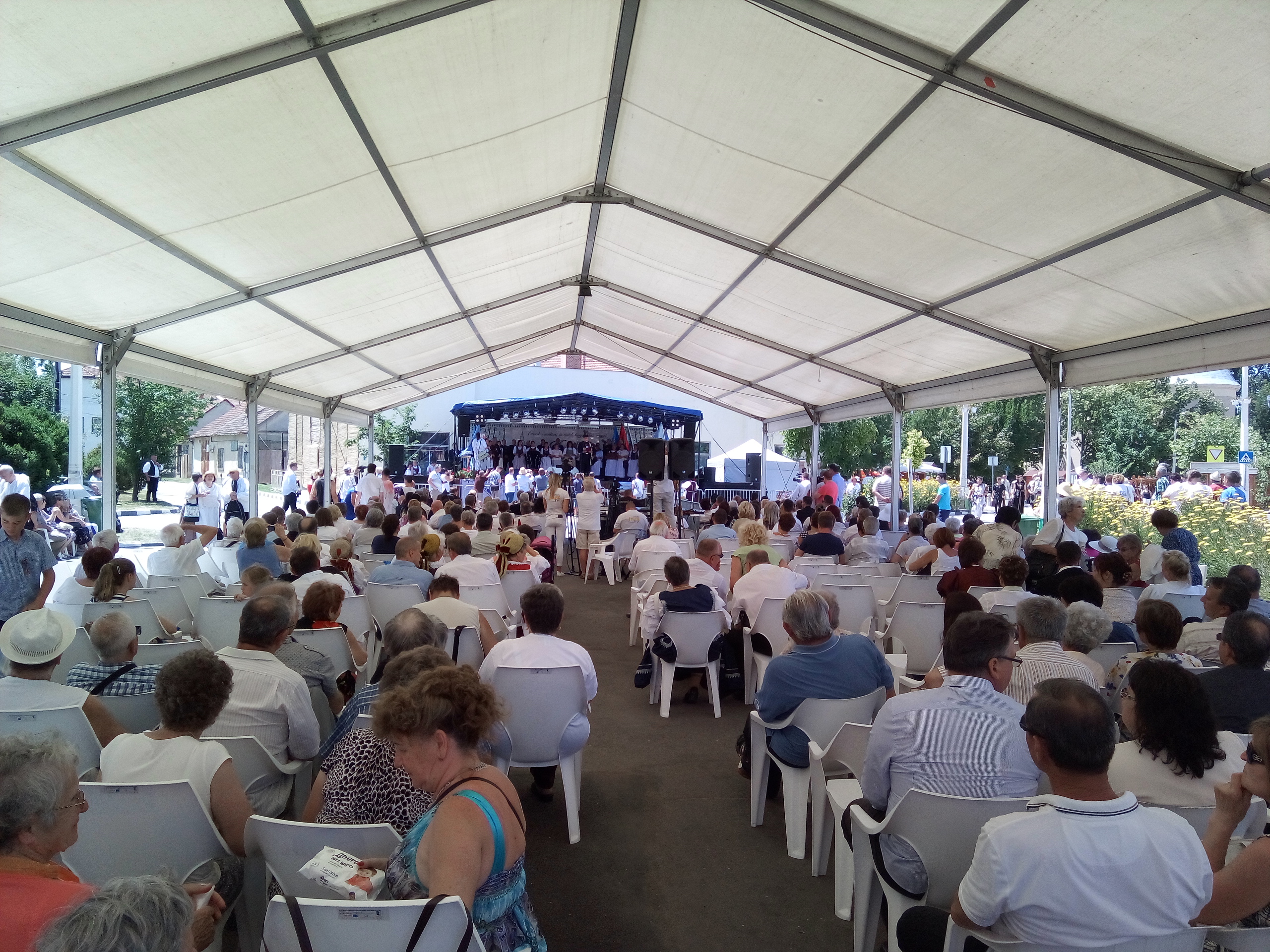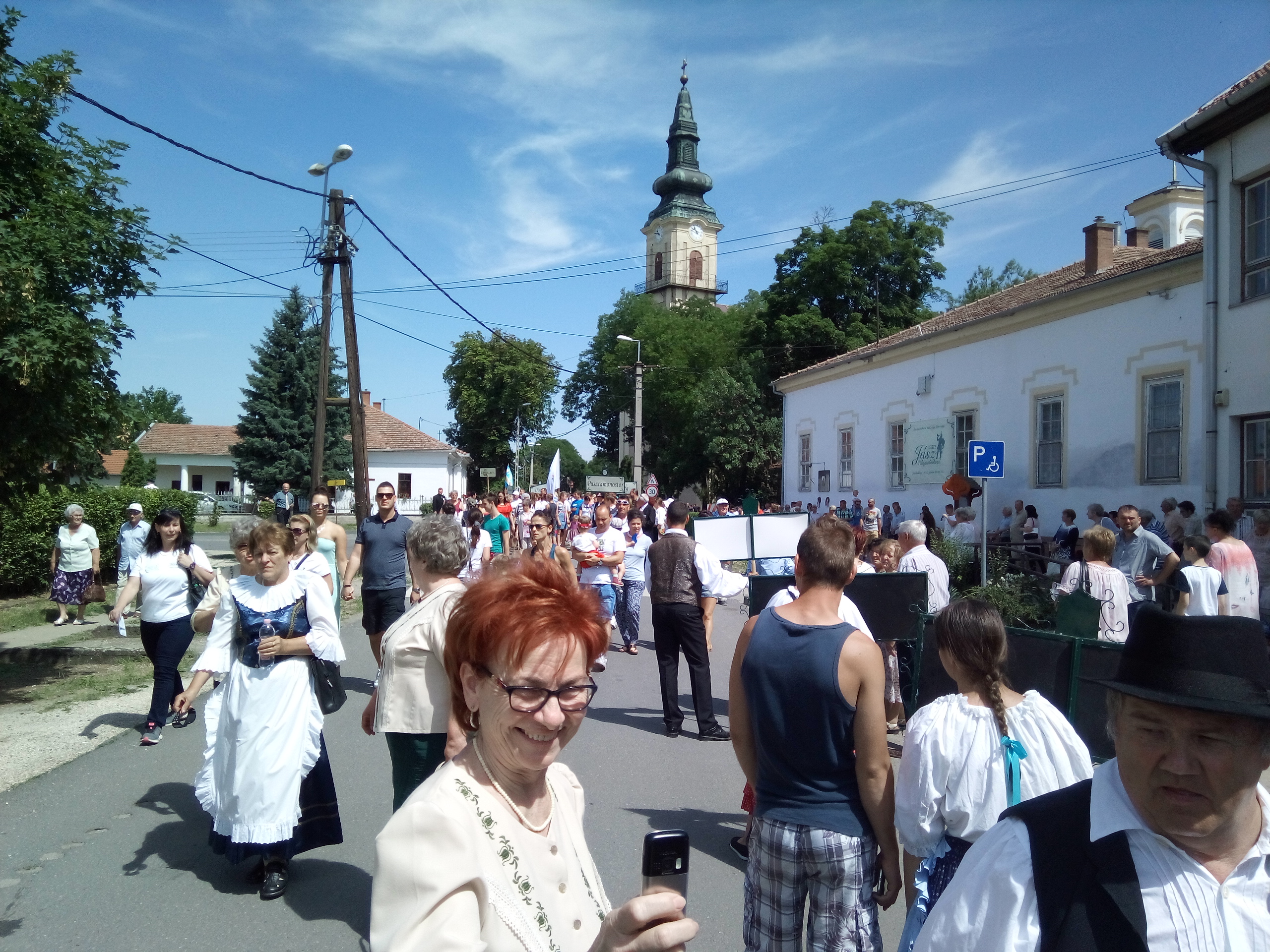 Ezek után végre ebéd, majd települések csoportjainak bemutatói. Felléptek a mieink is, elnézést, a videó minőségéért, és amiért kettő darabban van, de… a délelőtt padon hűsölő közmunkások beültek mögénk, és minek után a mi népünk művészete iránt nem kívántak tiszteletet mutatni, és próbálták ellehetetleníteni a jászok kulturált szórakozását… meg kellett kicsit szakítsam a felvételt. De legalább nem csak az egyébként nagy pozitívumként bőségesen osztogatott lajosmizsei ásványvíz miatt éreztük magunk otthonosan.